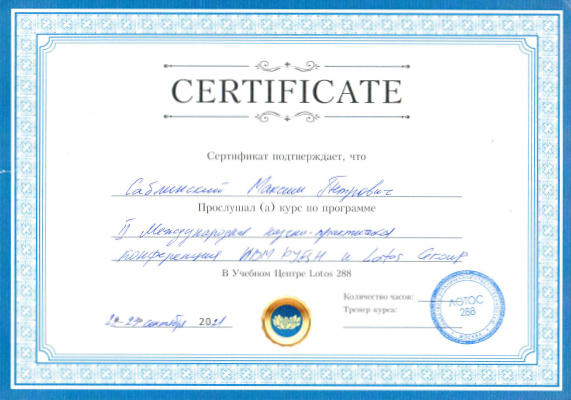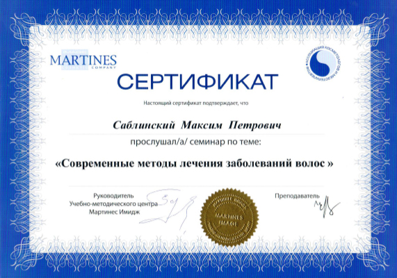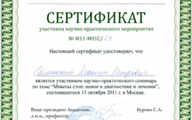 - Курс повышения квалификации по программе «Андрология», Уральская государственная медицинская академия дополнительного образования, г. Челябинск, 2004 г.
