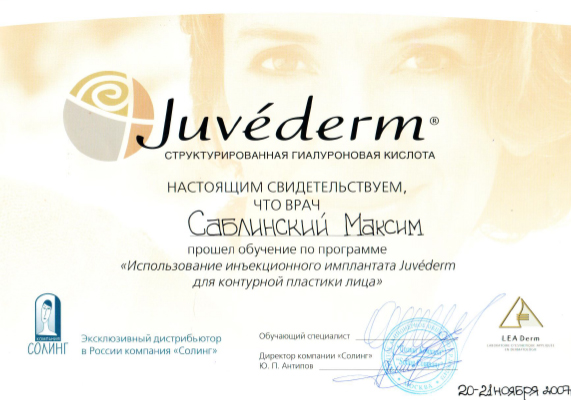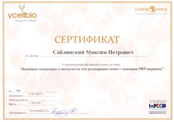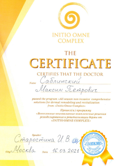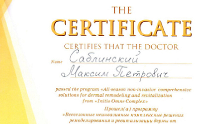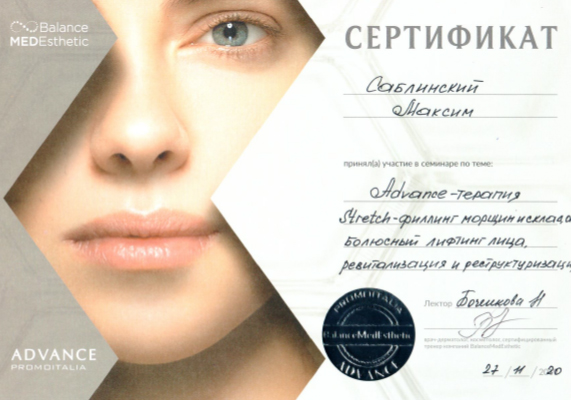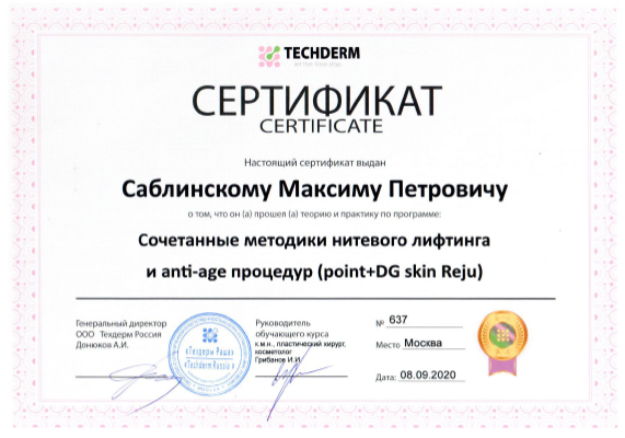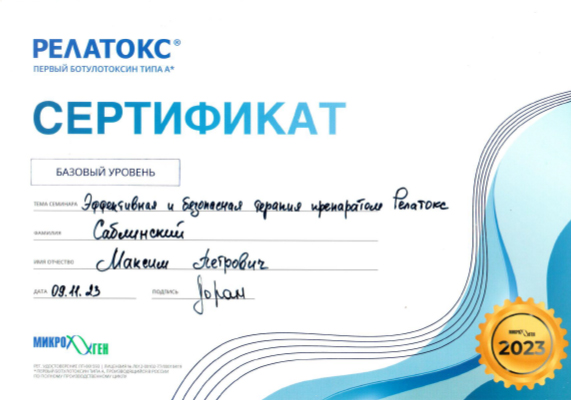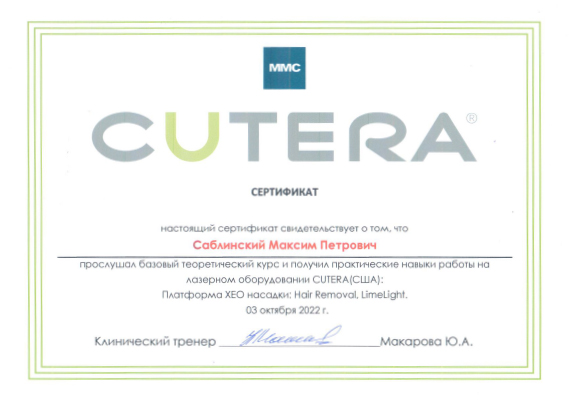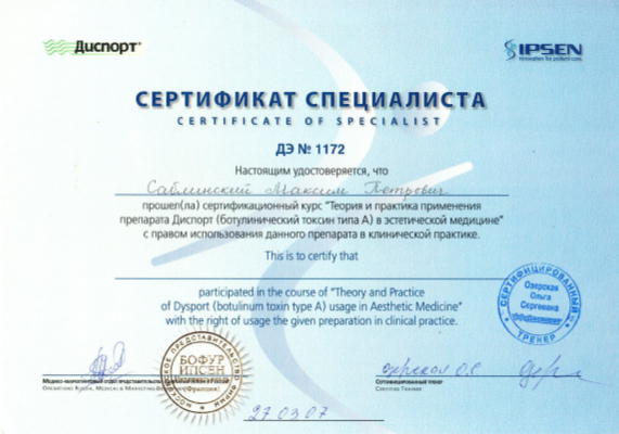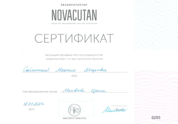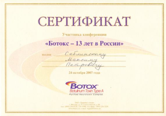 - Курс повышения квалификации по программе «Ботулотоксин в косметологии», кафедра эстетической медицины А. В. Майоровой, Российский университет дружбы народов, 2006 г.