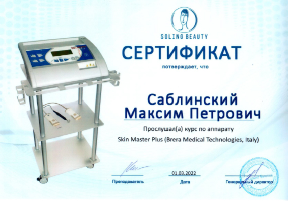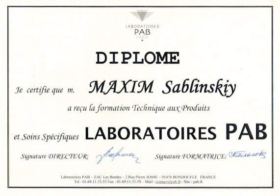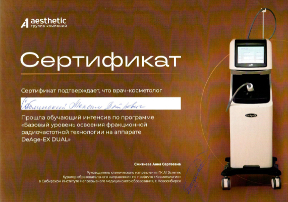 - Курс повышения квалификации по программе «Аппаратная косметология и физиотерапия в эстетической косметологии», кафедра эстетической медицины А. В. Майоровой, Российский университет дружбы народов, 2006 г.