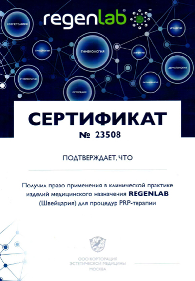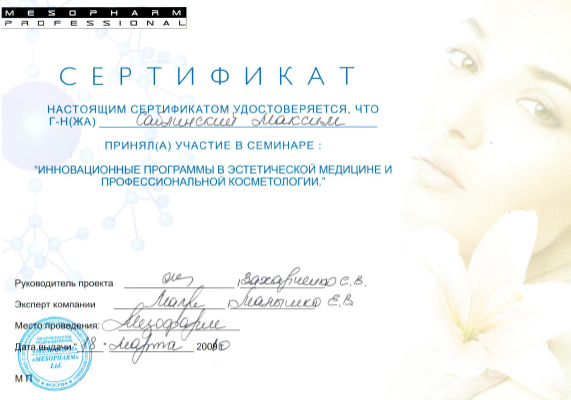 - Курс повышения квалификации по программе «Мезотерапия», кафедра эстетической медицины А. В. Майоровой, Российский университет дружбы народов, 2006 г.