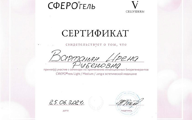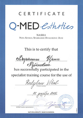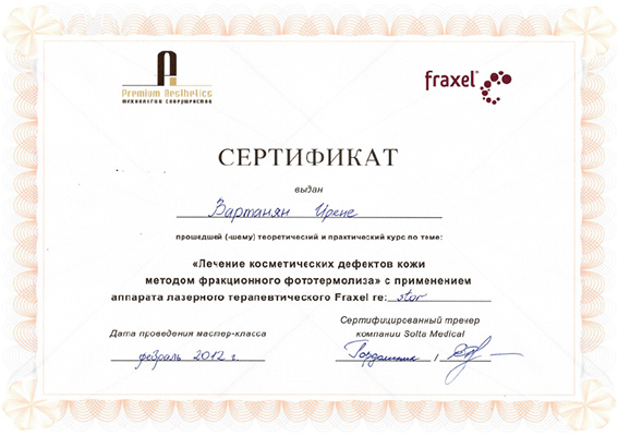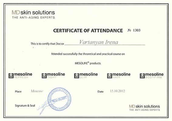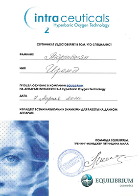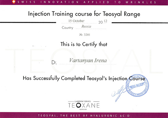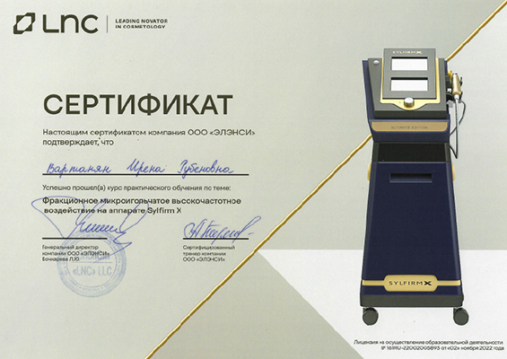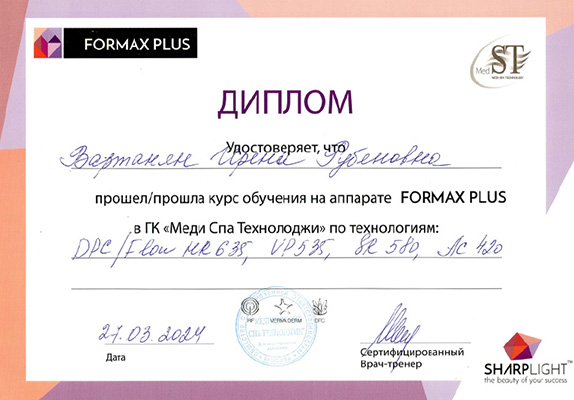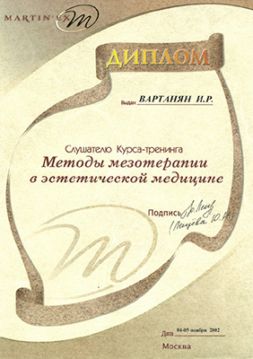 - Профессиональная переподготовка по специальности «Косметология», Российский университет дружбы народов, 2013 г.
