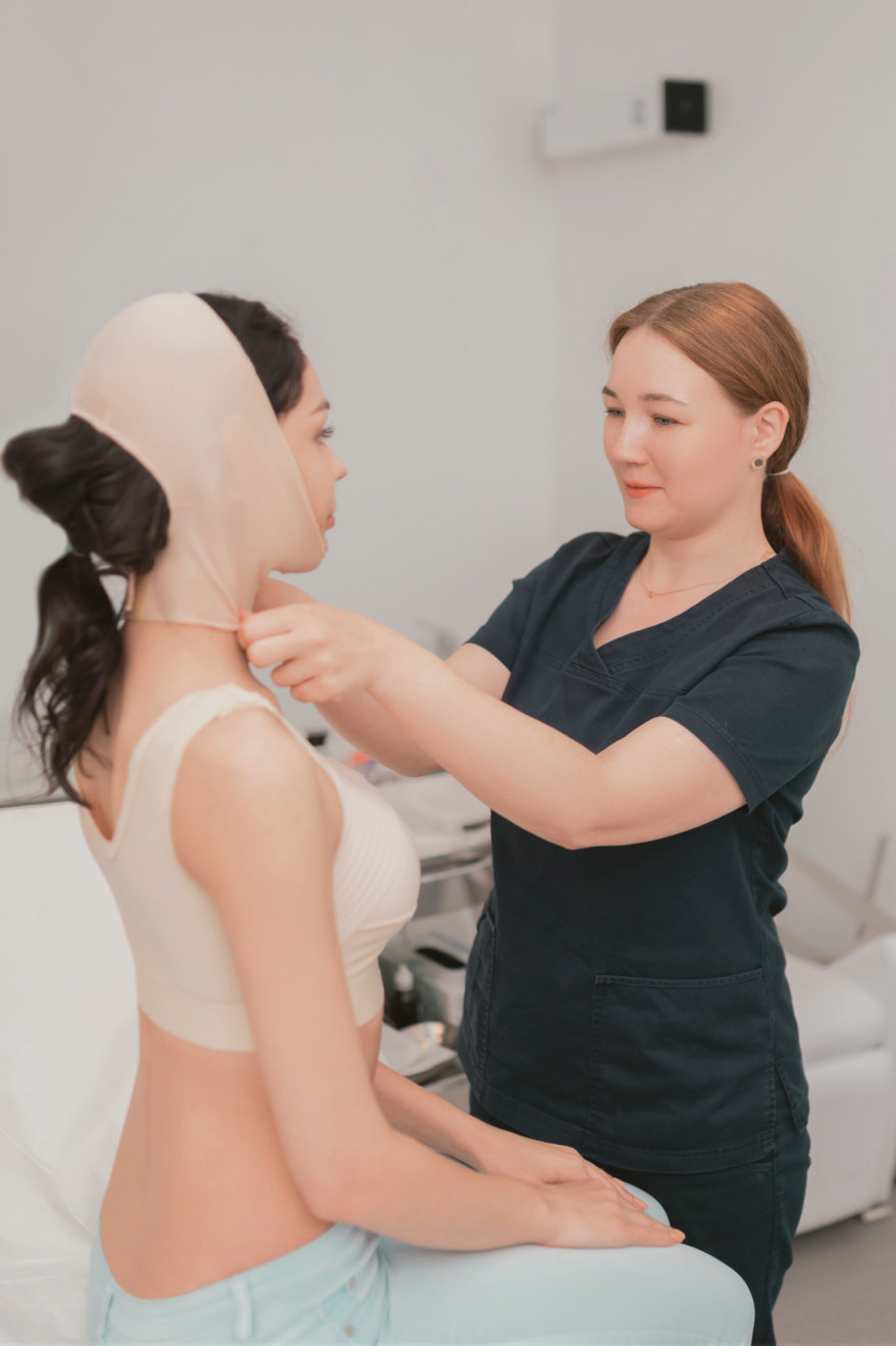 Первые 7 дней пациент носит компрессионную повязку, не снимая. Она обеспечивает необходимое давление, помогает сформировать правильный контур, предотвращает образование гематом и отеков.