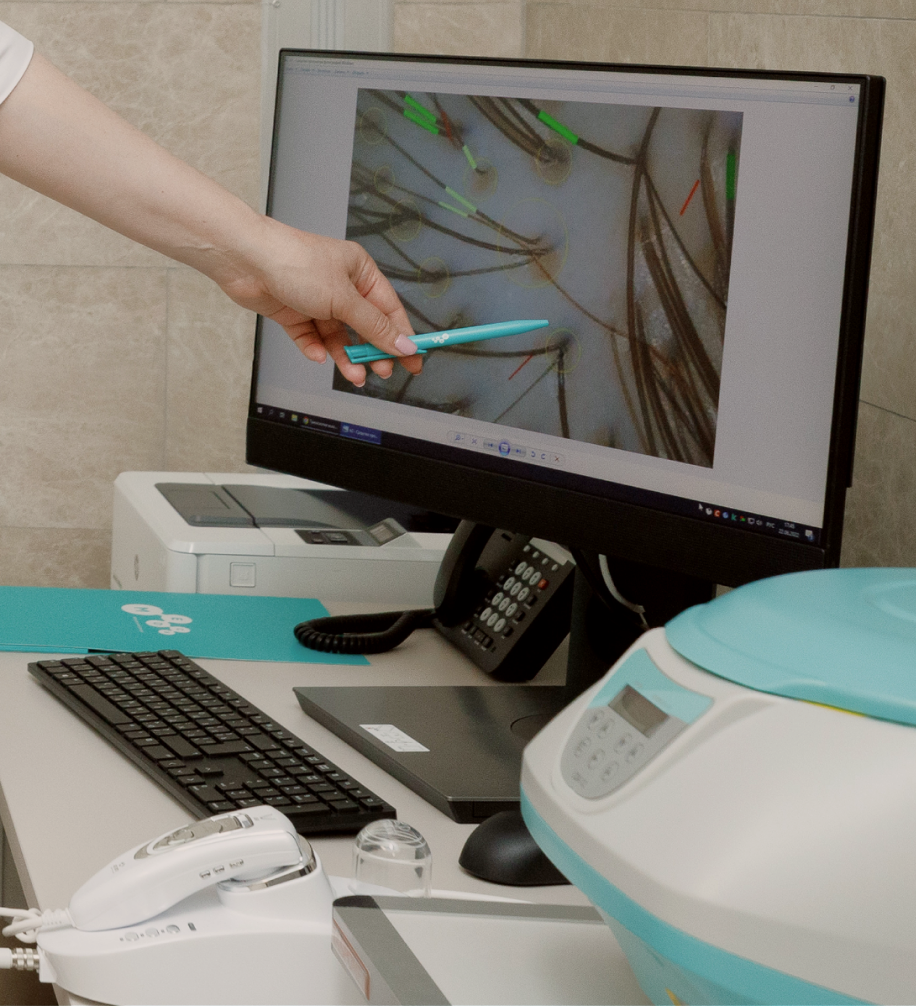 На приеме врач собирает анамнез, проводит трихоскопию (осмотр волос и кожи головы под увеличением), оценивает состояние кожи, определяет тип и причину проблемы. При необходимости назначает дополнительные обследования (анализы крови, гормональный профиль, УЗИ щитовидной железы).