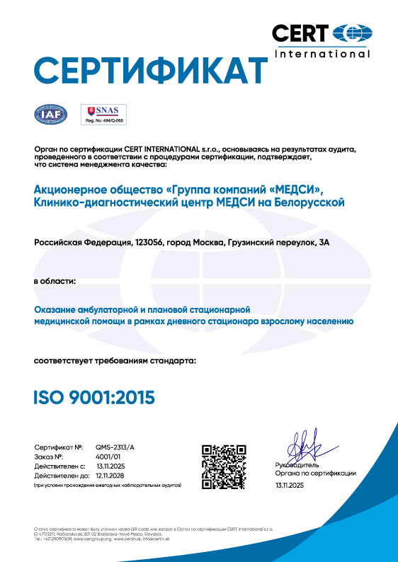 - КДЦ МЕДСИ на Белорусской» является первым частным медицинским центром в России, получившим международный сертификат качества ISO 7101:2023