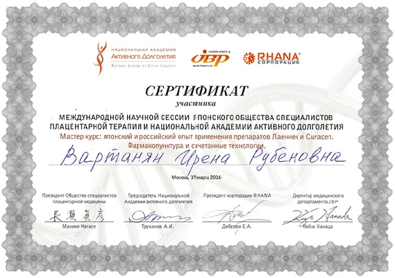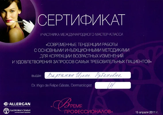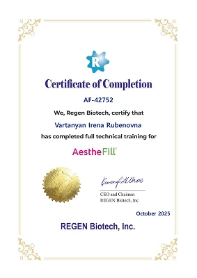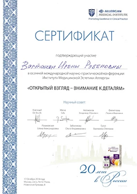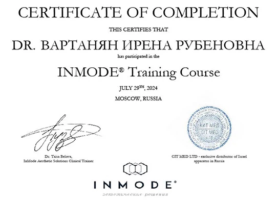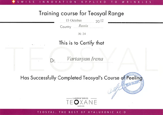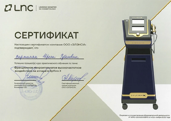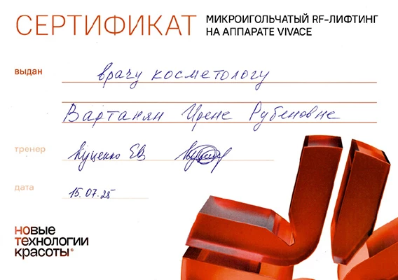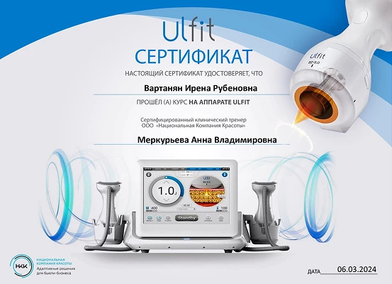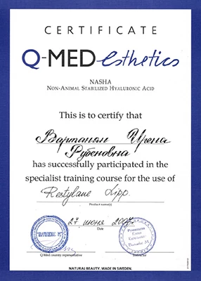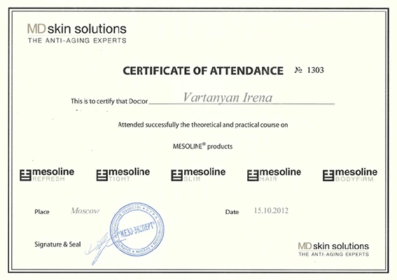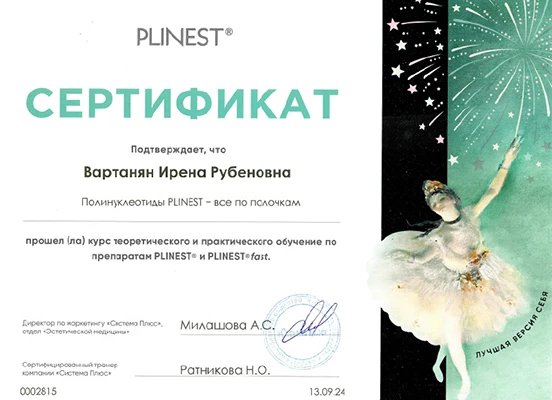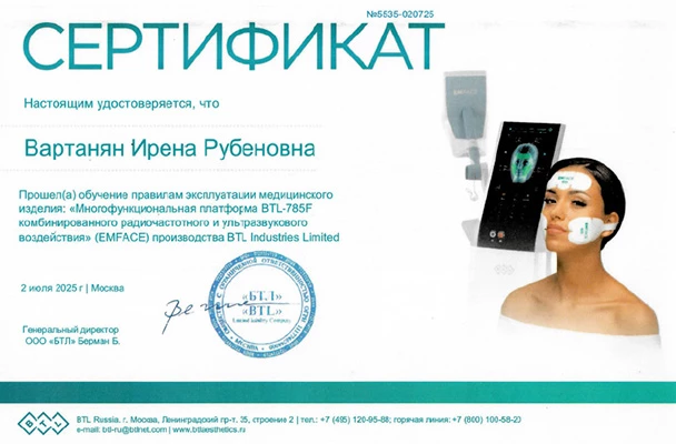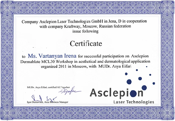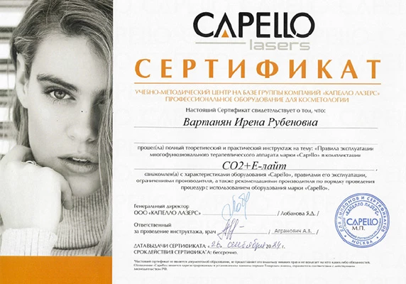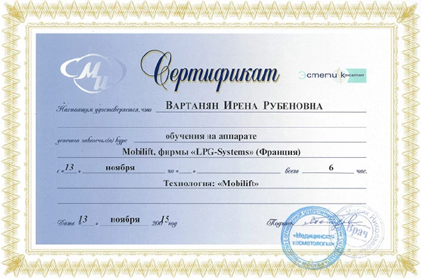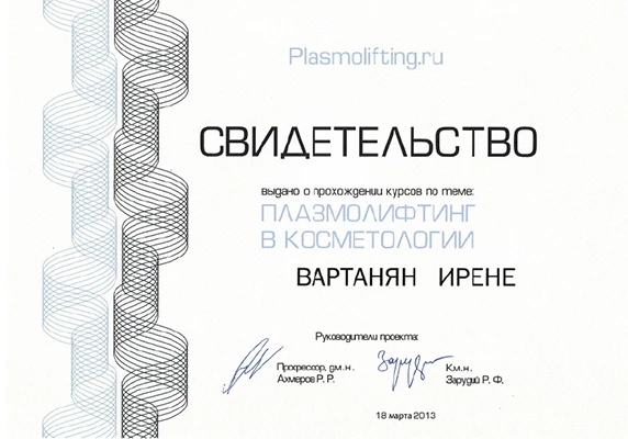- Профессиональная переподготовка по специальности «Косметология», Российский университет дружбы народов, 2013 г.
