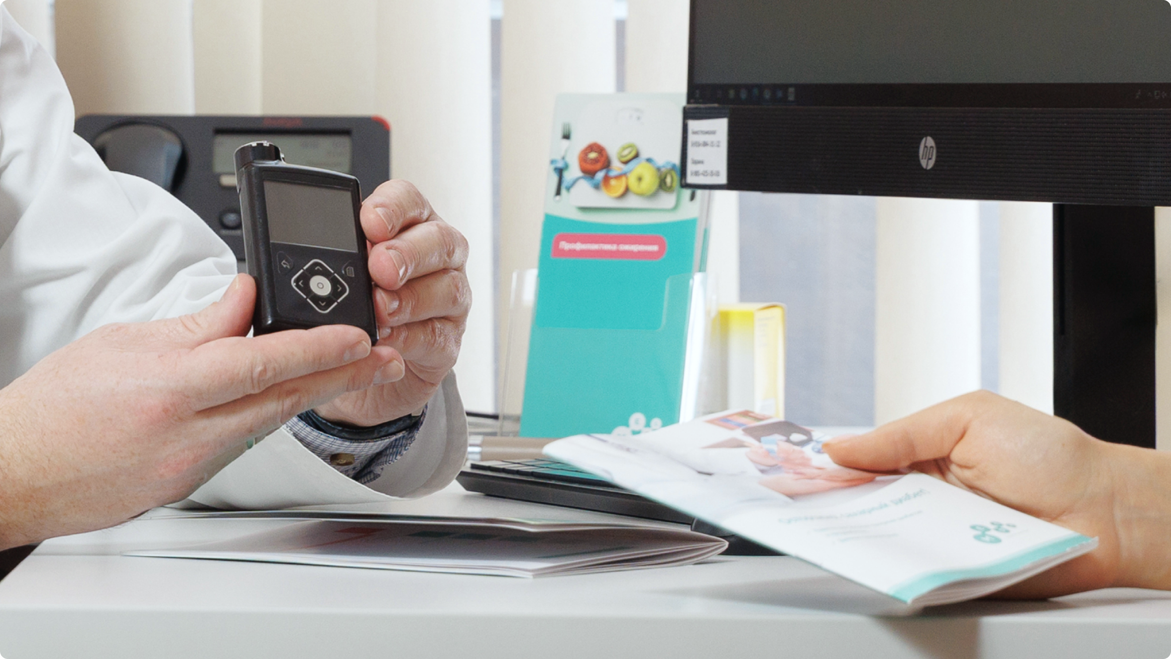 - Обучение контролю сахара, управлению прибором, коррекции доз инсулина, действиям при риске гипогликемии или кетоацидоза